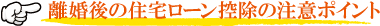 住宅ローン控除は、ローンを組んでいる方が自宅として住んでいる住宅が対象となります。つまり、ローンを組んでいる方が自宅を出ていく形の離婚では、住宅ローン控除は受けられません。 「ローンを組んでいる夫が離婚後もそのまま自宅に住む」というケースや「自宅に残る妻の名義で、住宅ローンを借り換える」というケースも妻が控除を受けることができますので、問題はないでしょう。 |